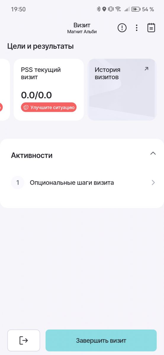 После оформления заказов шаг визита будет отмечен бирюзовой галочкой — он успешно пройден. Значит, можно завершить визит, кликнув по кнопке «Завершить визит»: