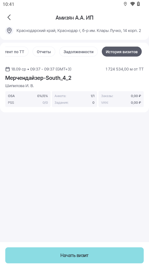Откройте нужную ТТ и нажмите кнопку «Начать визит».