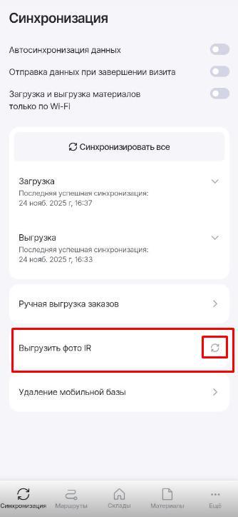 - Чтобы все фотографии выгрузились на портал Jedai, на странице Синхронизация нажмите на «Выгрузить фото IR»: