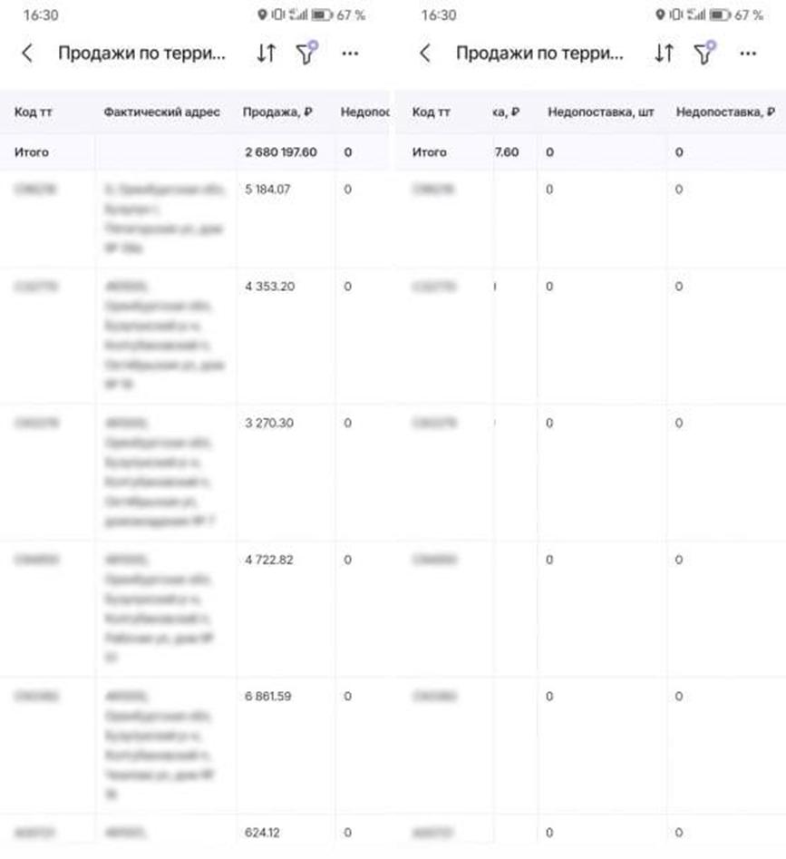 - Дебиторская задолженность. От дистрибьюторов приходят данные о долгах на определённых торговых точках. Данные о долгах сортируются в отчёте либо по торговым точкам, либо по накладным.