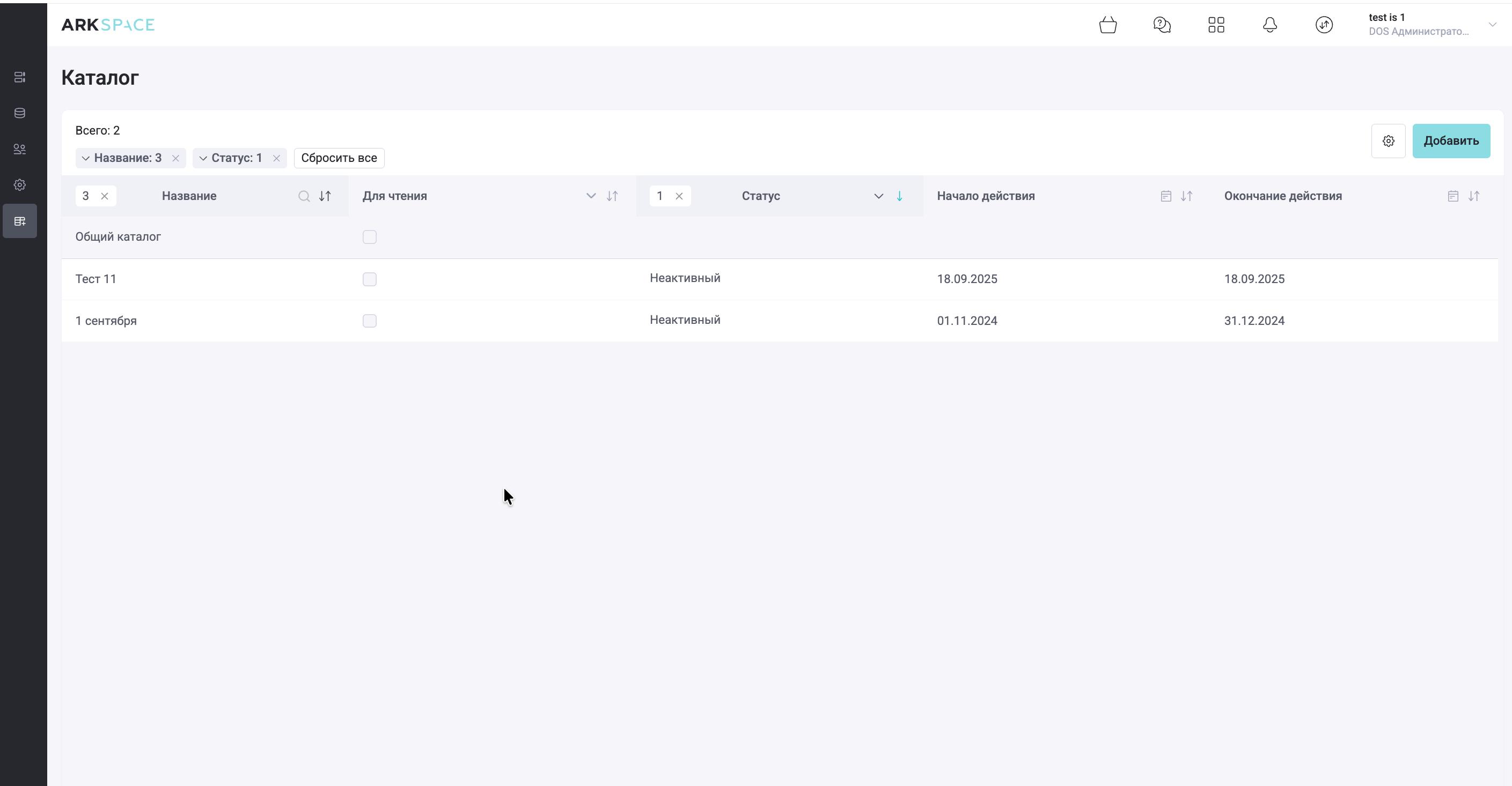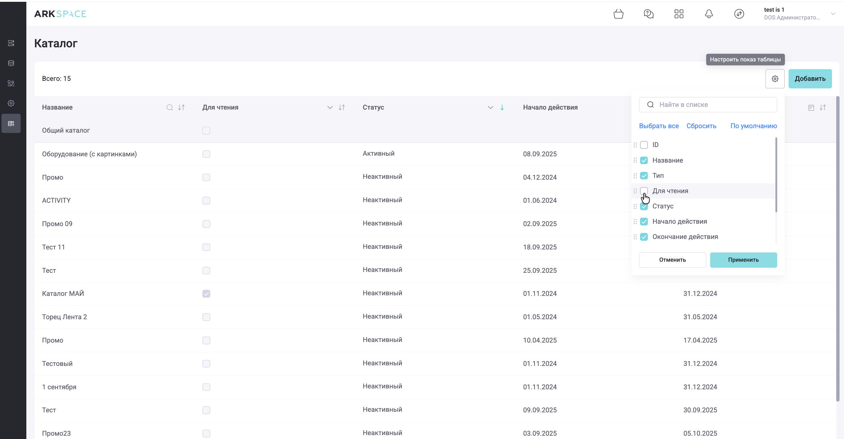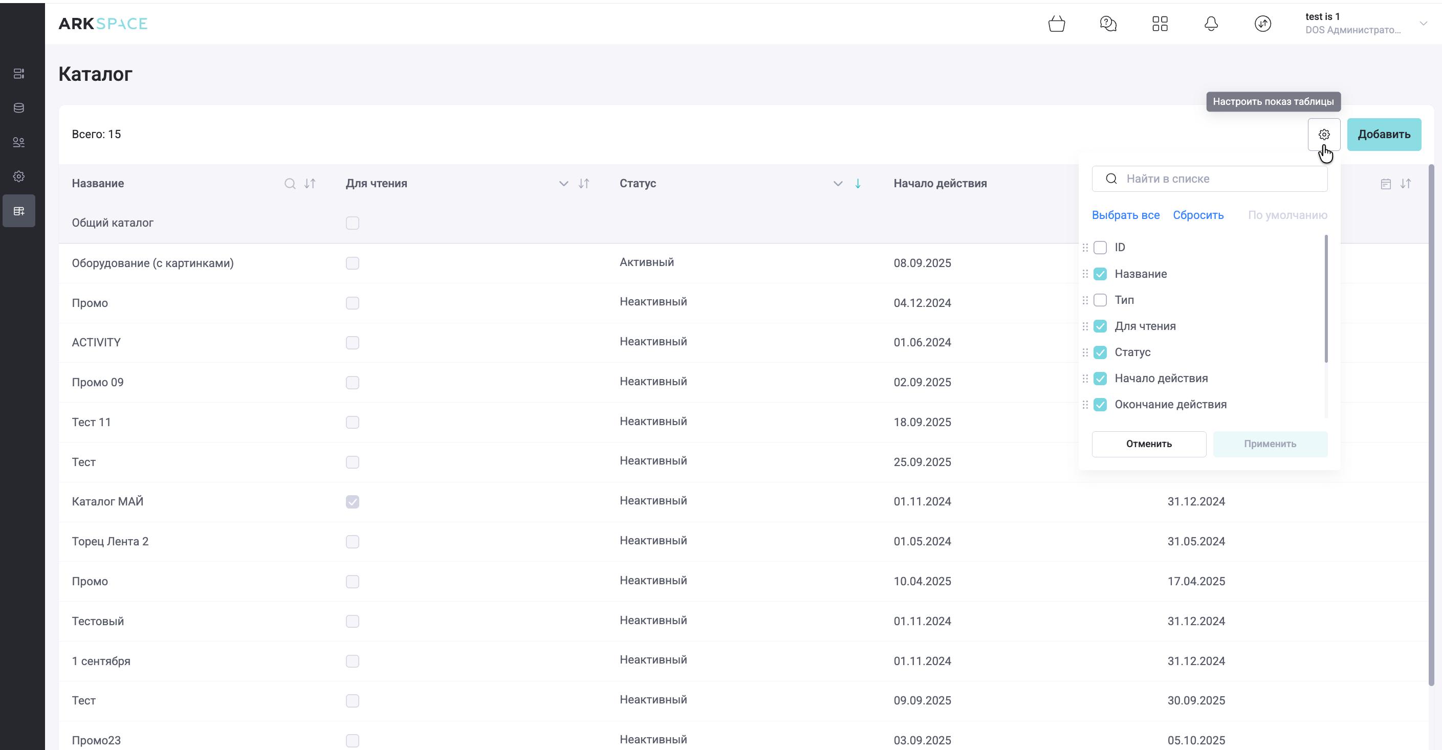 Функционал раздела «Каталог» административной панели содержит перечень существующих каталогов, которые ранее были созданы в системе, структурированные в виде таблицы. По умолчанию новые каталоги выводятся в начале списка, а созданные ранее ниже.