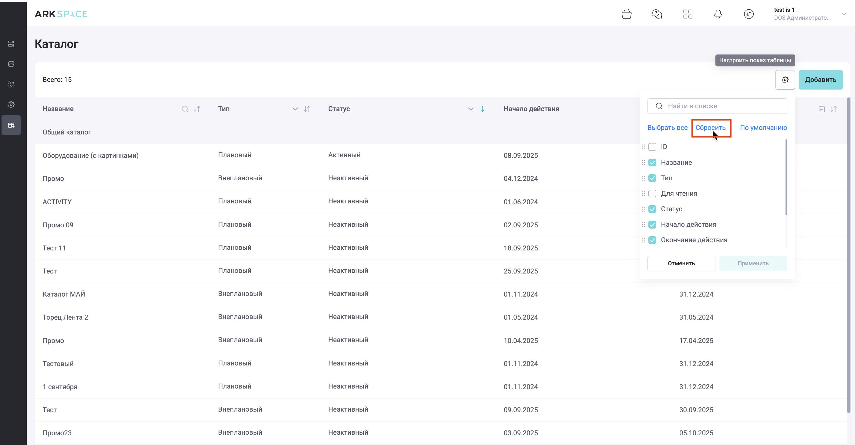 Нажмите кнопку «Сбросить», чтобы снять все чекбоксы со столбцов. После этого пользователь может отметить только необходимые столбцы и нажать кнопку «Применить».