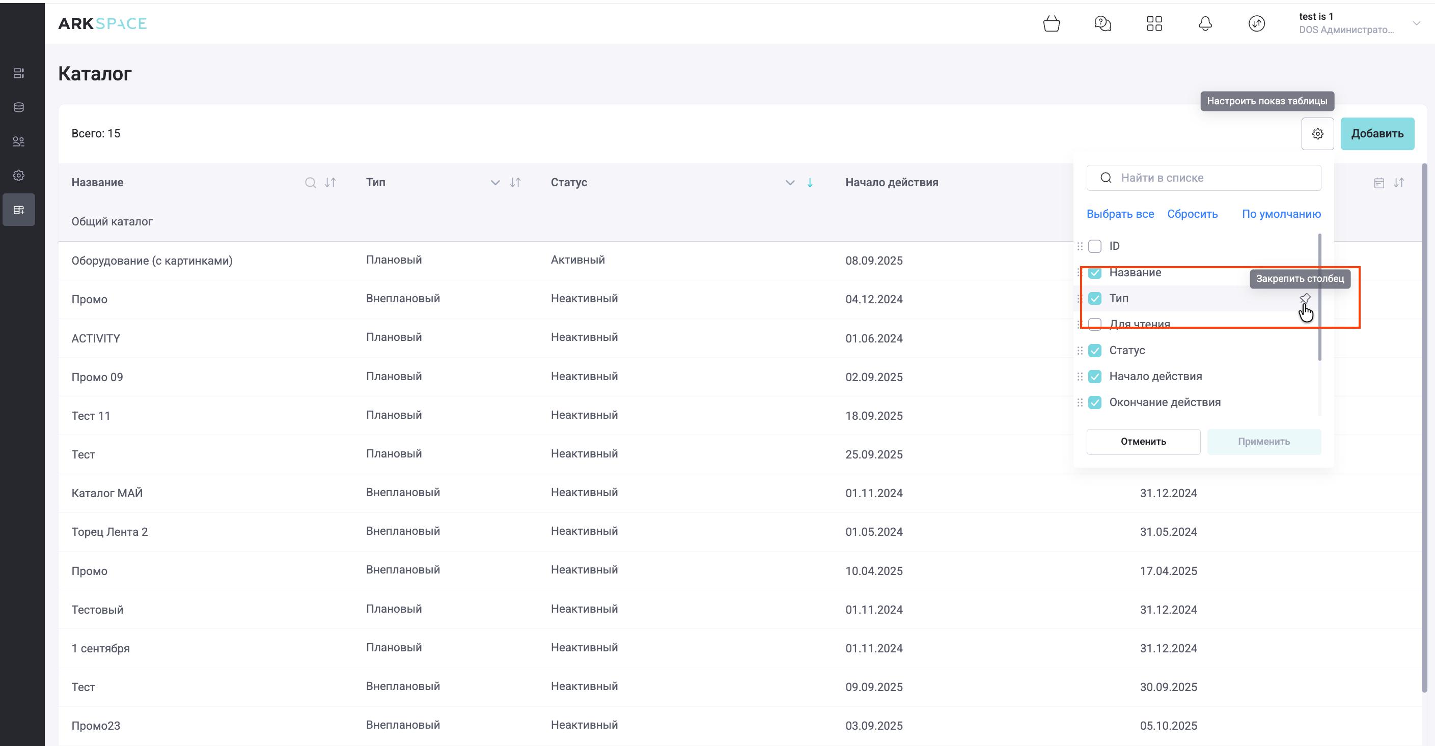 Пользователь может закрепить определенный столбец в функционале настройки показа таблиц, для того, чтобы это поле невозможно было вручную перемещать. Для этого необходимо навести курсор на нужный столбец и нажать на кнопку "Закрепить столбец". Аналогичным образом его можно открепить.