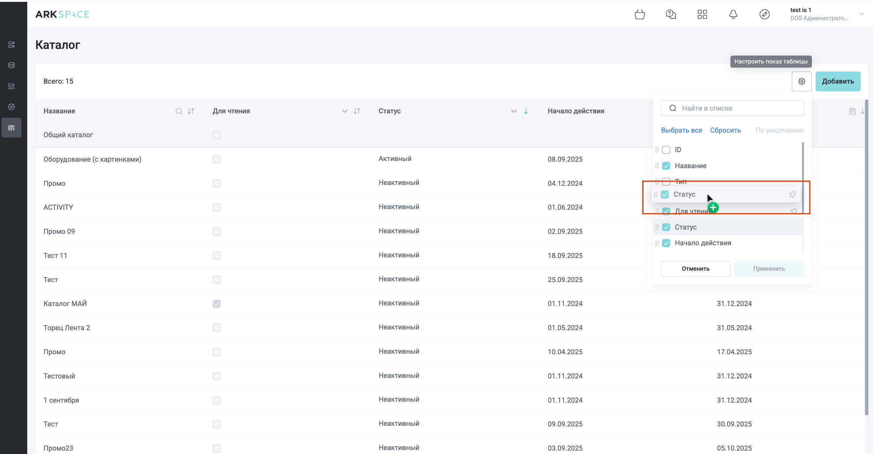 Чтобы переместить столбцы в таблице, наведите на нужный столбец курсор мыши, зажмите кнопку мыши и переместите выбранный столбец в нужную позицию, нажмите кнопку "Применить":