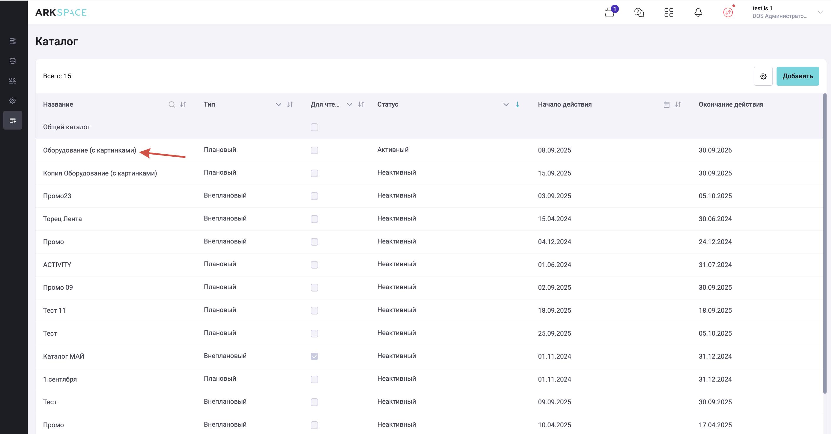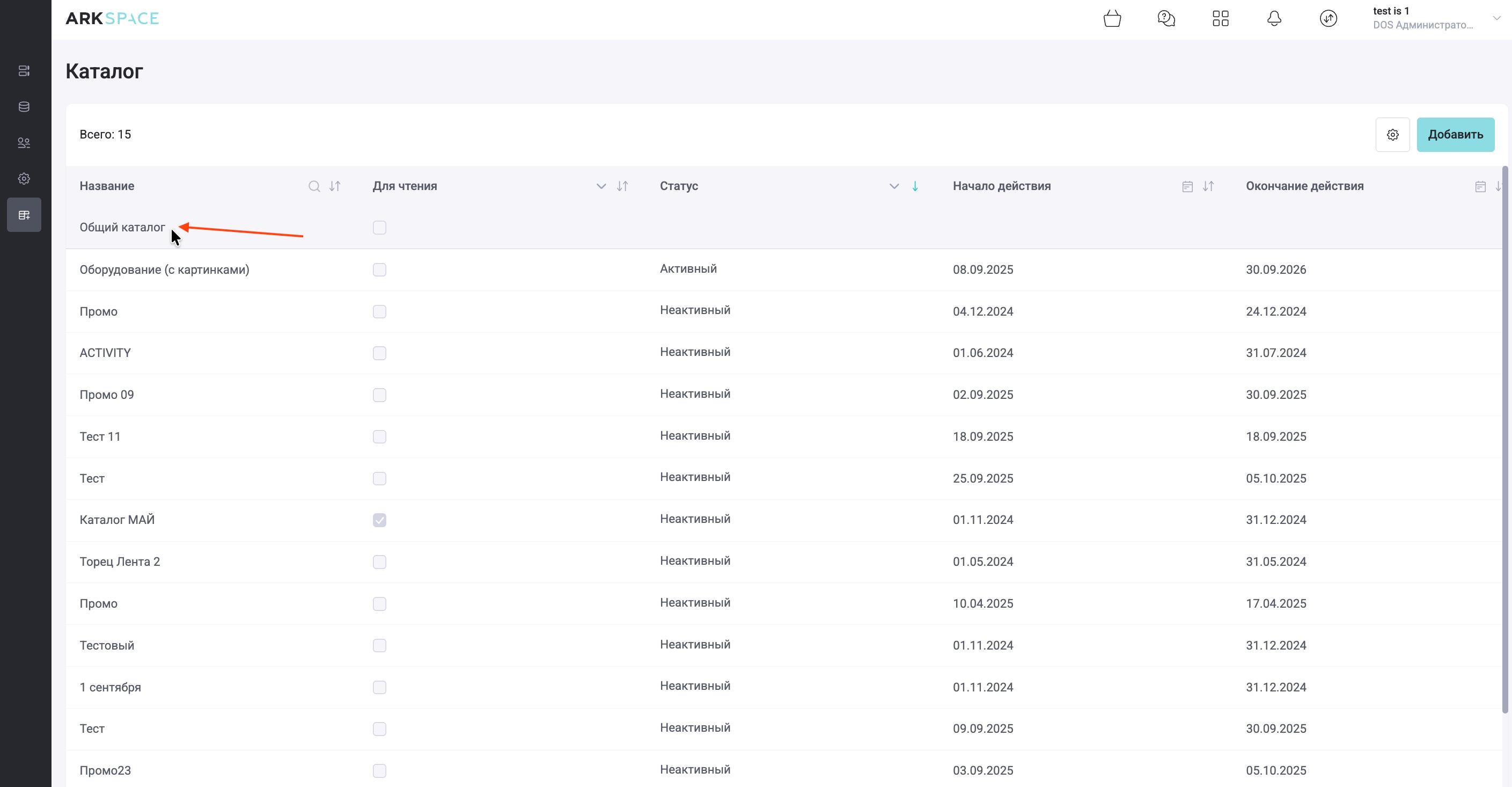 Первая строка таблицы закреплена, в ней по умолчанию выводится Общий каталог, который содержит всё ТО, которое есть в системе.
