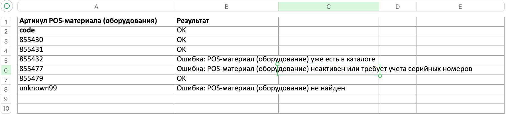 3. Если условие не выполнено, выводим в протокол строку ошибки «Ошибка: POS-материал (оборудование) неактивен или требует учета серийных номеров» и переходим к обработке следующей строки.