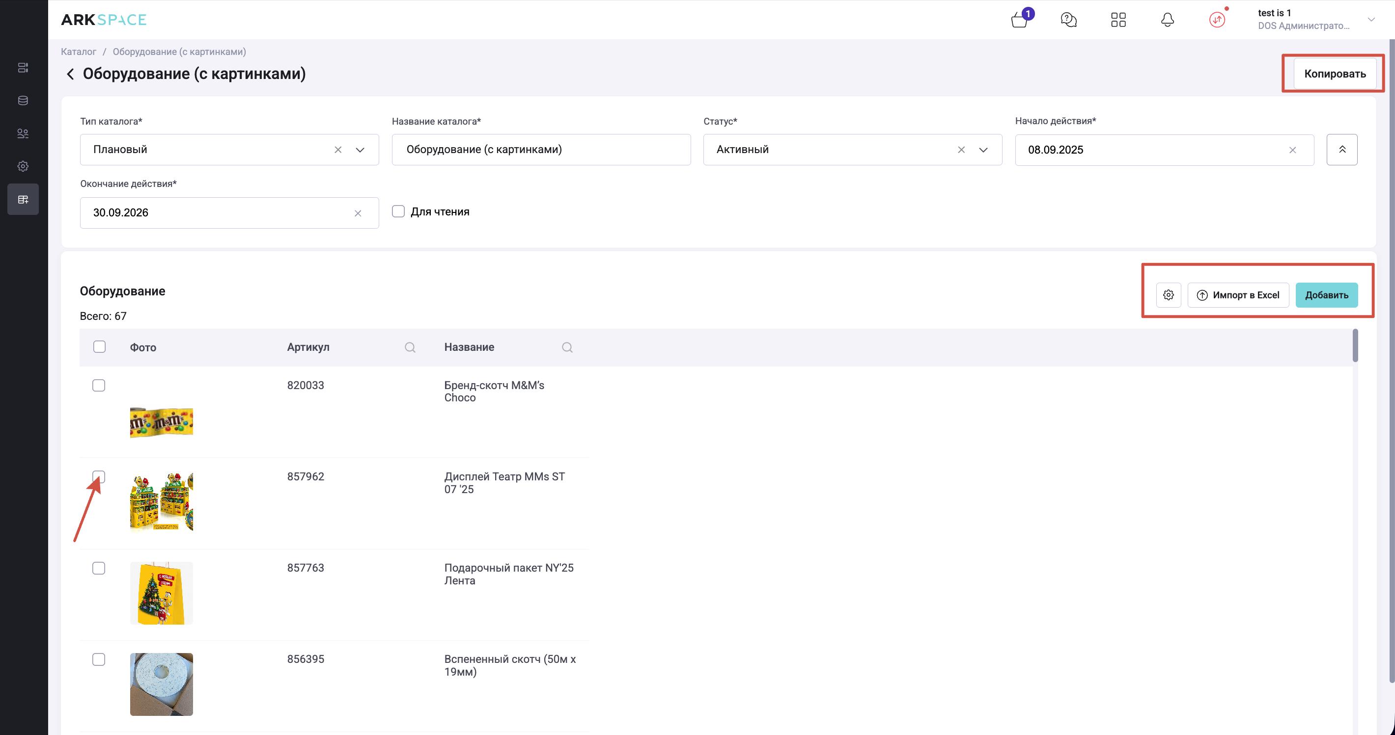 - Строки POS-материалов копируются из каталога-источника в новый созданный каталог, при условии что сам POS-материал активен и не требует учета серийных номеров.