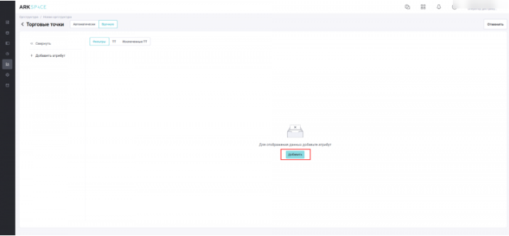 На этой вкладке показаны торговые точки, привязанные к выбранной оргструктуре. Список привязанных торговых точек определяет, какие торговые точки пользователи, привязанные к данной оргструктуре, будут видеть на веб-модуле.