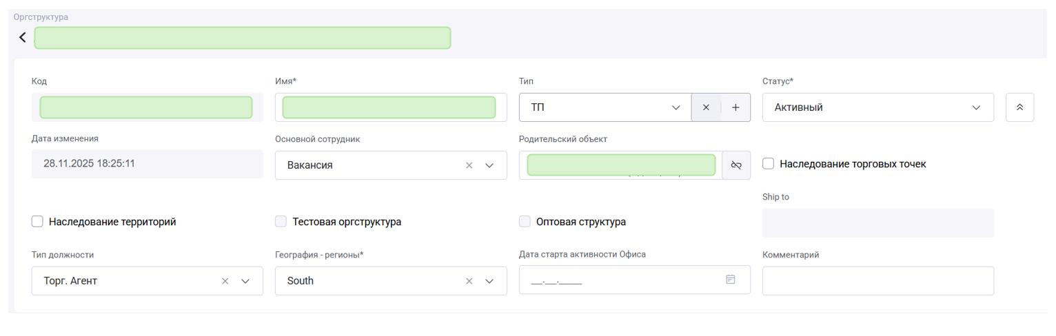 Наследование Торговых точек - отметка в данном поле означает, что данная оргструктура будет видеть в Центральном модуле не только торговые точки которые будут прикреплены за оргструктурой в блоке Торговые точки, но и торговые точки своих дочерних оргструктур. Для оргструктур с типом ТП данная отметка должна быть выключена, для TeamLead включена.