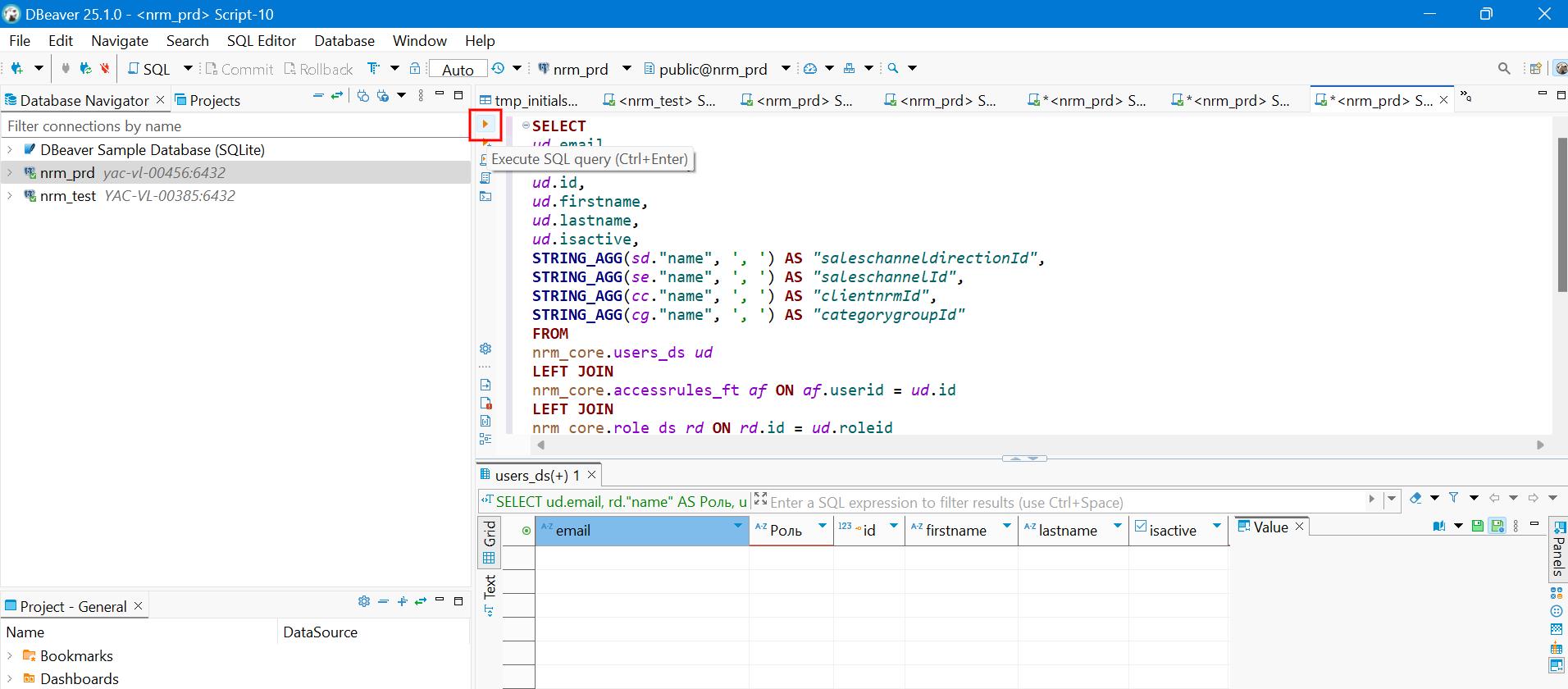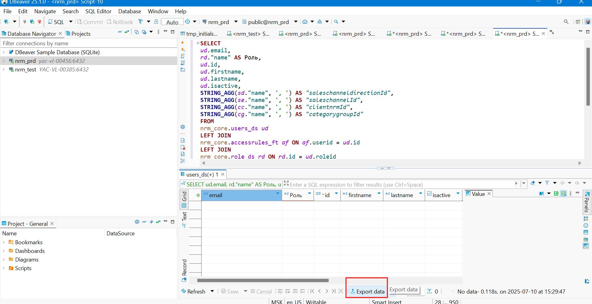 3. Скопировать и вставить селект для поиска деактивированных учетных записей, где ud.rowstatus = 1 - не удалённые пользователи, ud.isactive is false - учетная запись неактивна :