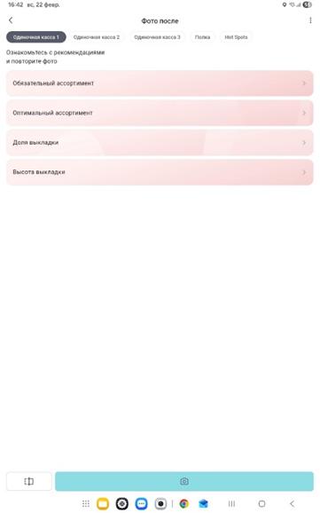 При нажатии на группу открывается список вопросов/рекомендаций, для обязательного ассортимента одиночной кассы, рекомендации имеют вид: