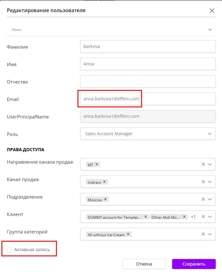 - Корректность информации о пользователе: Канал продаж, Клиент, Группа категорий.