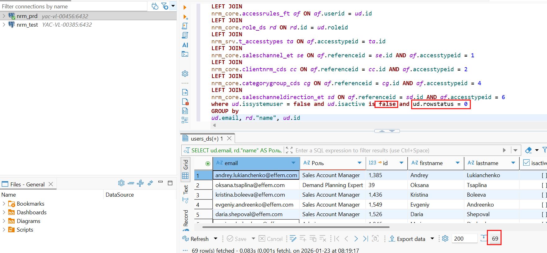 - Поиск активных пользователей, не подключенных к общей рассылке group_inplan_ru@effem.com, либо удаление деактивированных пользователей из рассылки.