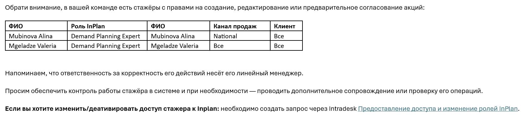 - Проверить что роль пользователя в Inplan соответствует его должности в Mars (Cотрудник отдела Demand не может быть с роль Sales Head).