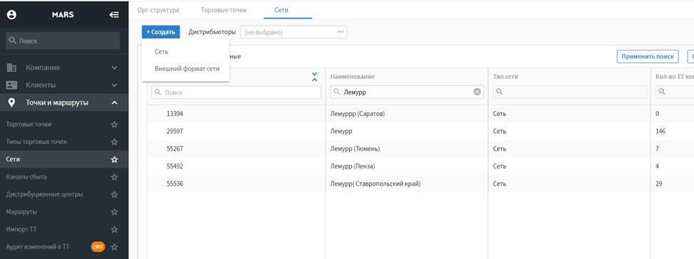1.Торговые точки и маршруты-Сети-Создать
